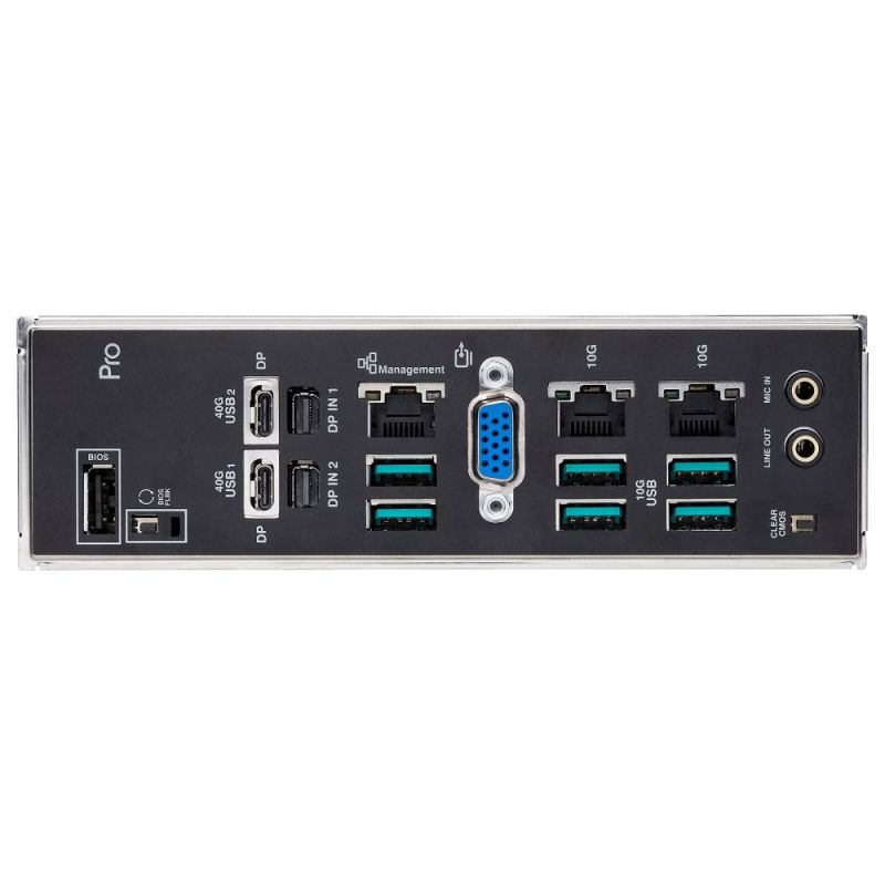 2 USB 40Gbps, 6 USB 10Gbps, USB 2.0, VGA, 2 mini DisplayPort IN, Intel dual 10Gb Ethernet, Realtek 1Gb Ethernet, 2 Audio jacks