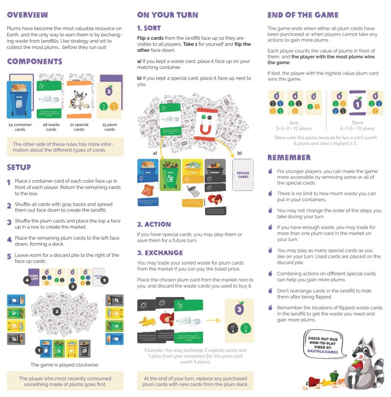 Plums for Trash is a competitive and educational recycling game in which players sort waste and exchange it for plums from the market. It includes four categories of waste that we often encounter in our daily lives. Each card features a unique illustration and an interesting fact about recycling that you may not know.