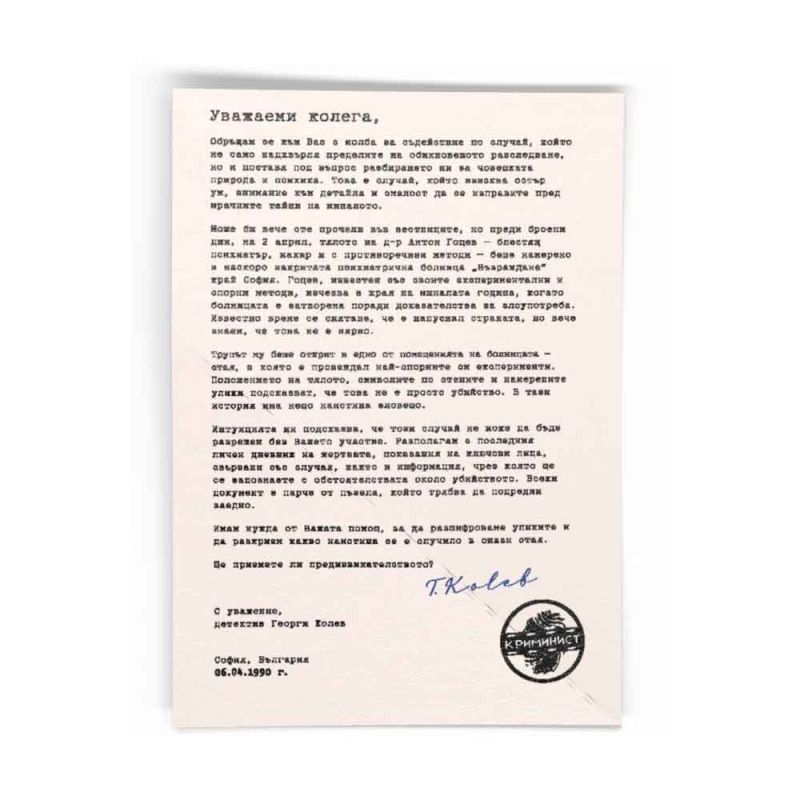 Може би вече сте прочели във вестниците, но преди броени дни, на 2 април, тялото на д-р Антон Гоцев – блестящ психиатър, макар и с противоречиви методи беше намерено в наскоро закритата психиатрична болница „Възраждане” край София. Гоцев, известен със своите експериментални и спорни методи, изчезва в края на миналата година, когато болницата е затворена поради доказателства за злоупотреба. Известно време се смяташе, че е напуснал страната, но вече знаем, че това не е вярно…“